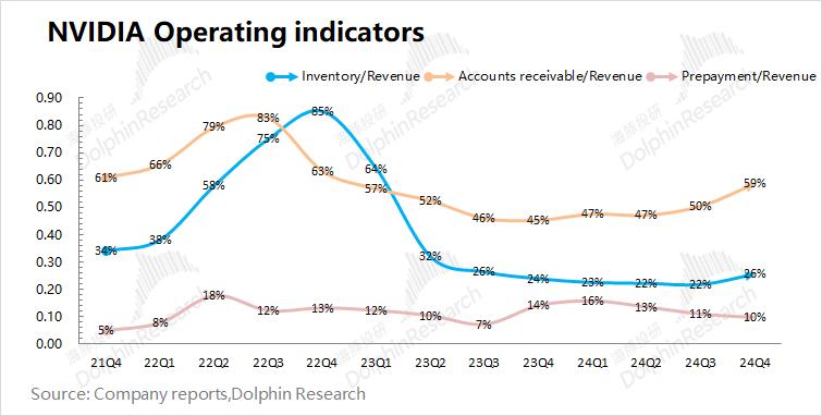3、主要财务指标:新产品备货明显增加,成本率稳步下降。在这个季度,英伟达的运营费用率持续下降到11.9%,收入的增长率抵消了费用的增长。本季度,该公司的存货端大幅上升至101亿美元,主要受到Blackwell商品备货的影响,但目前的存货比例仍处于相对较低的水平。。