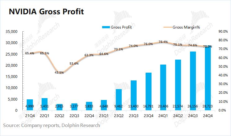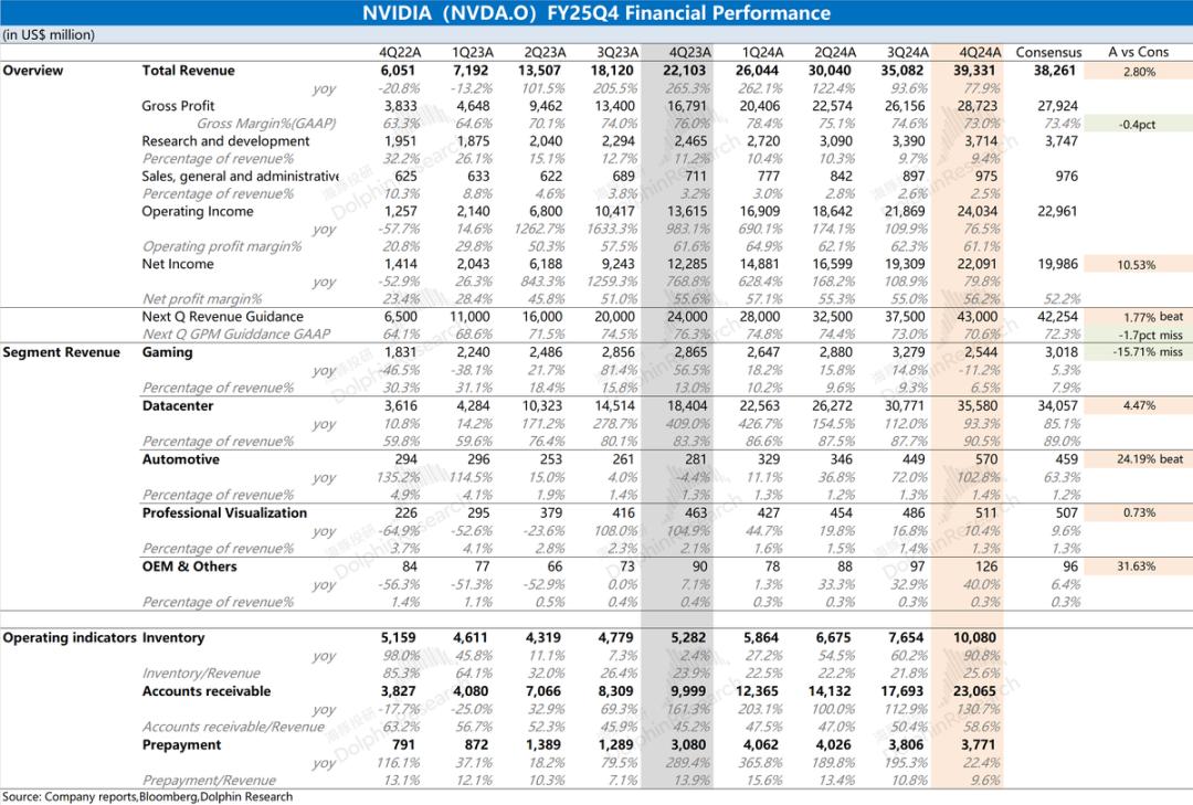 2.2 毛利率(GAAP):英伟达在2025财年第四季度实现毛利率(GAAP)略低于彭博一致预期的73%(73.4%)。目前公司的毛利率主要受数据中心业务的影响,而Blackwell本季度的大规模生产和上坡直接影响了公司的毛利率。