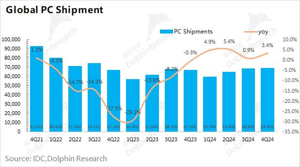 另外,PC市场的整体表现,也会影响到公司的游戏业务。根据IDC的最新数据,全球PC市场2024年第四季度出货量为6930万台,同比增长3.4%。由于游戏显卡主要搭载在PC上,目前PC市场已进入修复期,将对公司的游戏业务起到一定的推动作用。