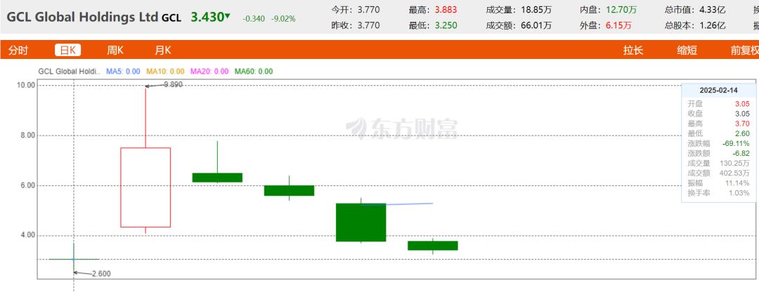 事实上,GCL上市后,股价波动很大。上市第一天,开盘和收盘均为3.05美元/股。2月18日,成交量上涨146%,以7.50美元/股收盘,但随后4日持续下跌,2月24日收盘,仅为3.43美元/股。