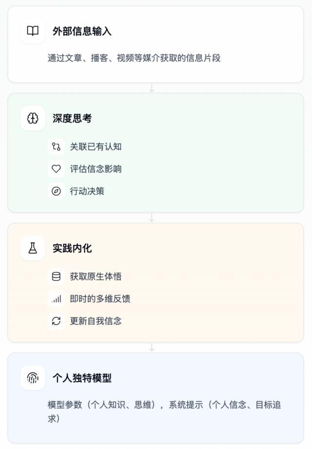 事实上,当我们通过文章、播客、视频获得别人的经验时,我们只接受语言符号编码的“知识片段”。要使这些外部信息真正内化为我们的一部分,需要经过两个关键的转变:深入思考和实践内在。