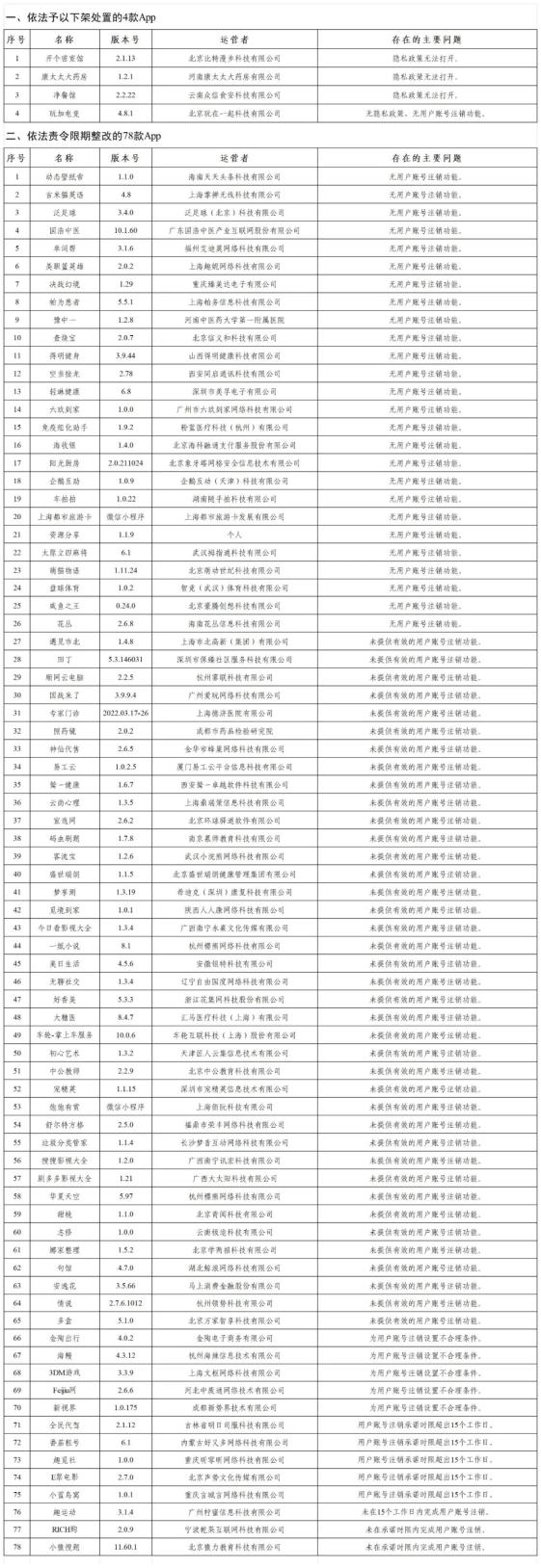 经调查,“开迷室馆”等四款应用存在未公开收集使用规则的问题,违反《个人信息保护法》等法律法规,依法依规下架;“动态壁纸帝”等78款应用未按法律规定提供删除或更改个人信息功能,违反《个人信息保护法》等法律法规,依法责令限期一个月完成整改。逾期未完成整改的,依法依规下架。