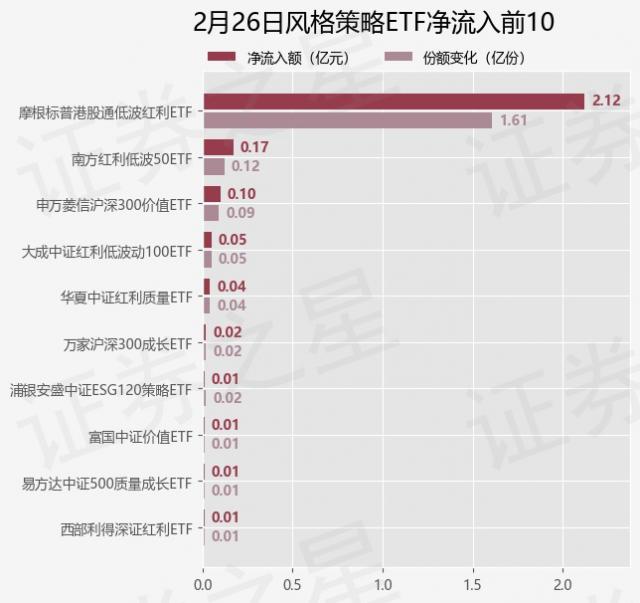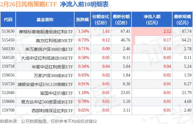当天有 10 只风格策略 ETF 资金净流入显示,其中摩根标普港股净流入排名第一。 ETF(513630),份额增加 1.61 十亿份,净流入额为 2.12 亿元。