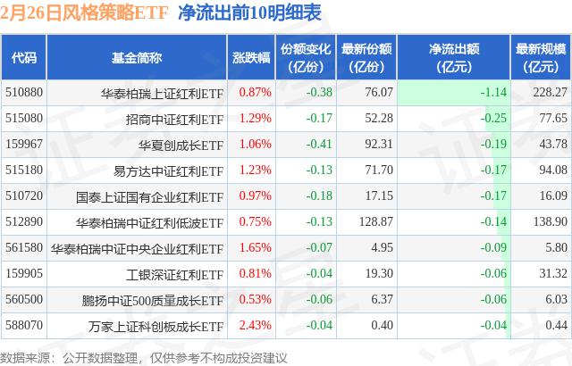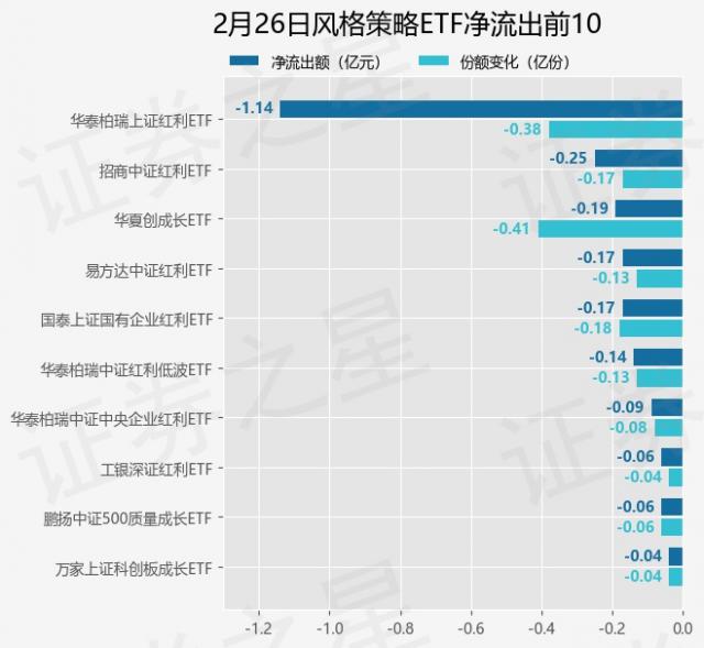 当天有 24 只风格策略 ETF 资金净流出,其中华泰柏瑞上证红利排名第一。 ETF(510880),份额下降 3800.0 万份,净流出额为 1.14 亿元。