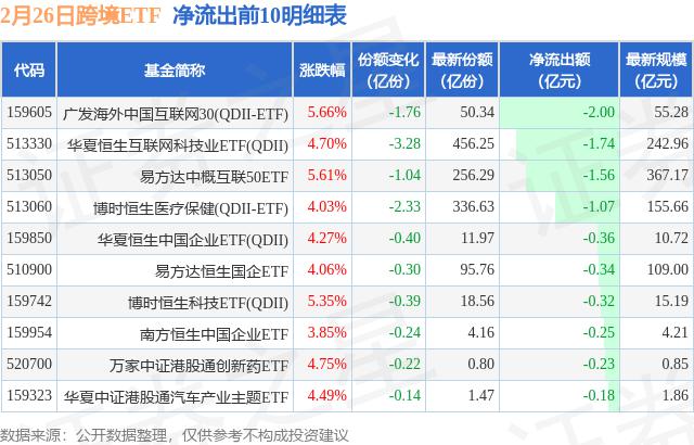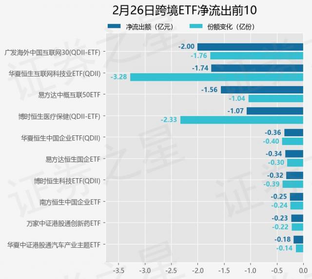 当天有 31 只跨境 ETF 资金净流出基金,其中净流出排名第一的是广发海外中国互联网。 30 ( QDII-ETF ) (159605),份额下降 1.76 一亿份,净流出额为 2.0 亿元。