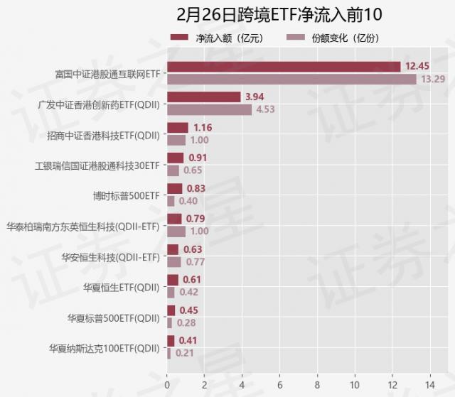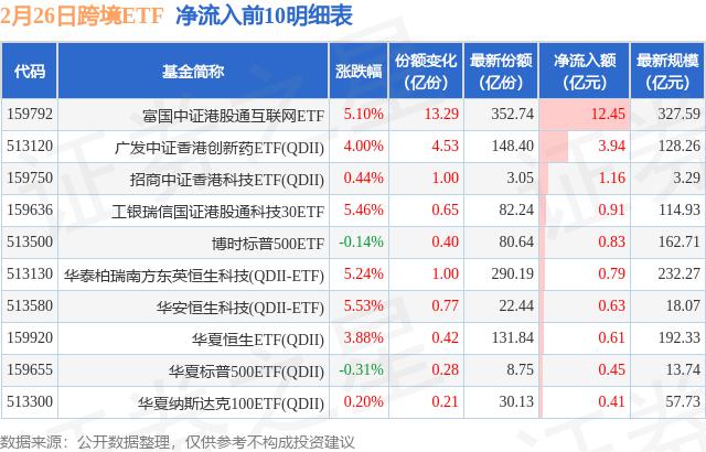 当天有 69 只跨境 ETF 资金净流入显示,其中净流入排名第一的是富国中证港股通互联网。 ETF(159792),份额增加 13.29 十亿份,净流入额为 12.45 亿元。