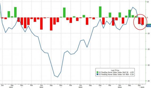 美国全国房地产经纪人协会(NAR)根据周四公布的数据,美国 1 月待售房屋销量(基于已签订合同但尚未转让的现房交易)环比下降 远远超出市场预期的4.6% 0.9% 减少幅度,同比下降 5.2%,跌幅均大大高于预期,创协会以来, 2001 2008年开始跟踪该指标至今的历史最低水平。