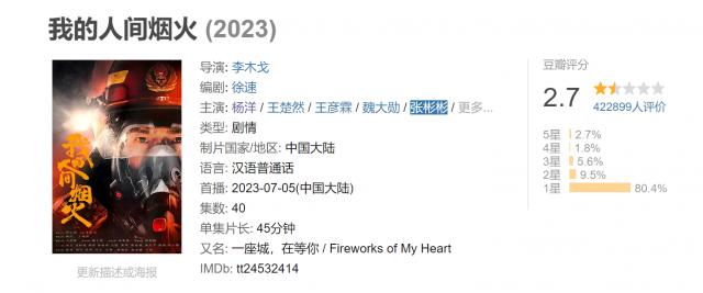 当时我其实是在想,杨洋应该是犯了公愤,被职业黑了。但是看到这个评分低到可以。 2.7 《我的人间烟火》,又觉得他被“黑”的并不冤枉。