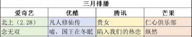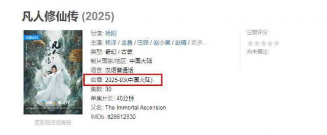 今日看到各种平台 3 月新剧排播单,优酷的《凡人修仙传》赫列其中,不禁想吐槽:你别抠搜了,1 月便开始预约,结果预约了。 2 这个月也没有看到任何定档消息。