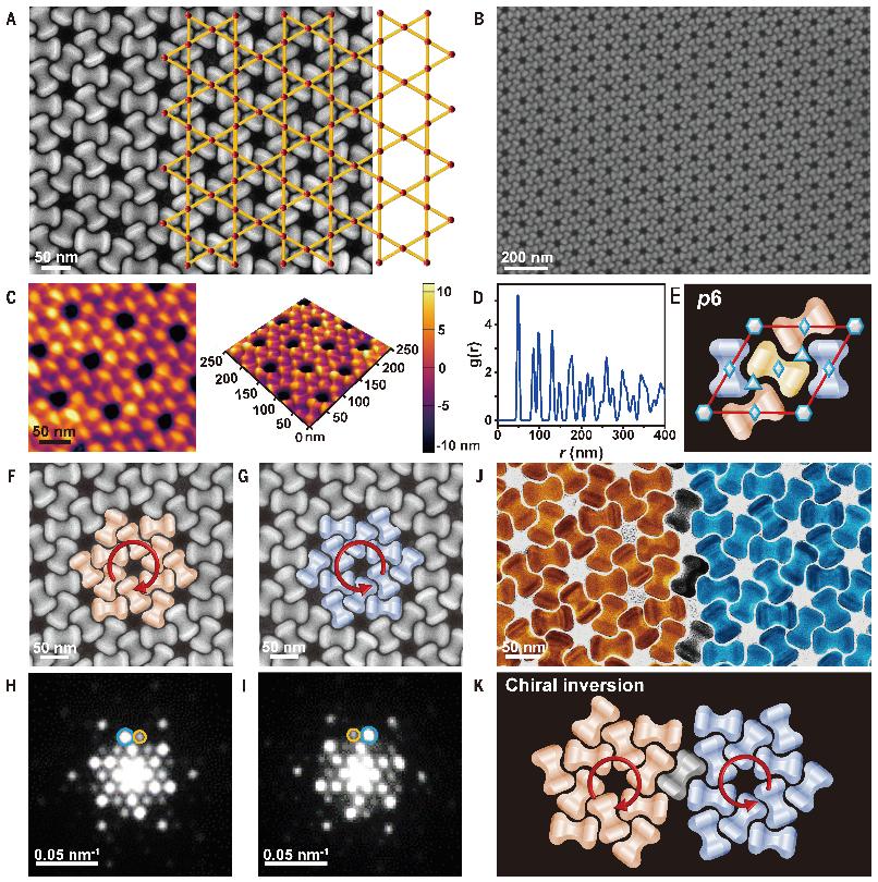 通过优化生成条件,该研究获得了高质量的二维Kagome超晶格,基于汽液界面组装技术,其单晶面积可达数十平方米μm,包含超过10万个哑铃形颗粒,凹凸互锁。"这一精度是一般3D打印和光刻技术无法比拟的,纳米自组装技术在物质制备方面的优势再次显现。”李同涛说。这款Kagome超晶格具有p6对称性,表现出独特的面内手性,有望带来全新的光学性质。