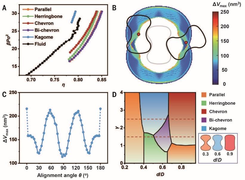 根据理论计算,非密集Kagome超晶格是一种热学稳定性,新加坡南洋理工大学倪冉教授团队通过模拟分析确认其稳定性来自曲率介绍的吸引力。在此分析的基础上,研究小组进一步简化了模型,构建了哑铃颗粒超晶格的结构理论预测框架,为深入了解非凸纳米颗粒的自组装行为提供了重要的理论依据。