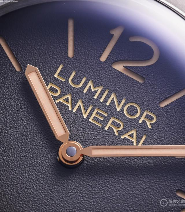 新款 Luminor 庐米诺 1628,第一个变化是使用新的颗粒渐变表盘。此前,沛纳海的表盘主要是油漆表面或拉丝放射线表盘。近年来,沛纳海开始使用颗粒表盘,在一些重要风格上增加了渐变颜色,这不仅增加了复古感,也显示了更多的盘面细节。