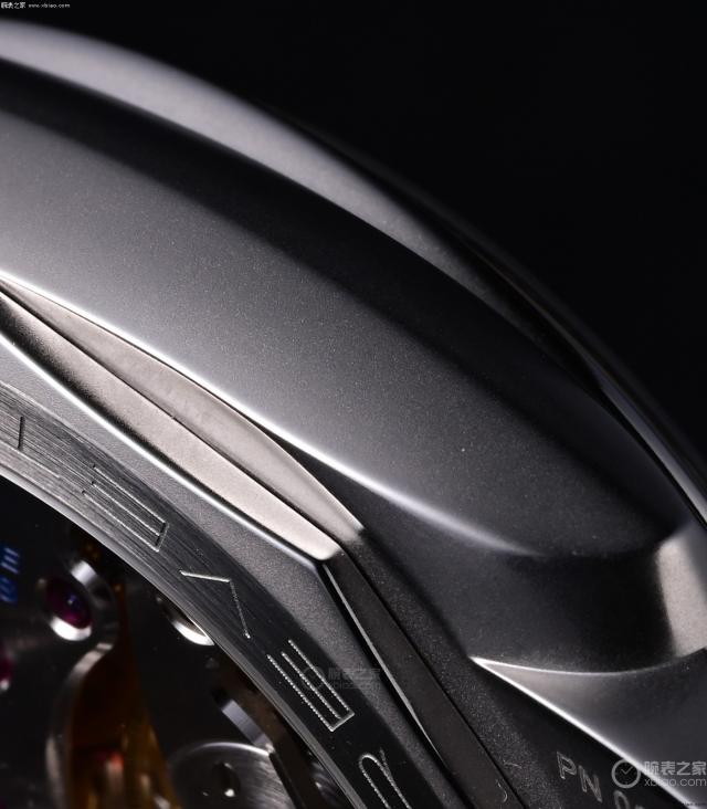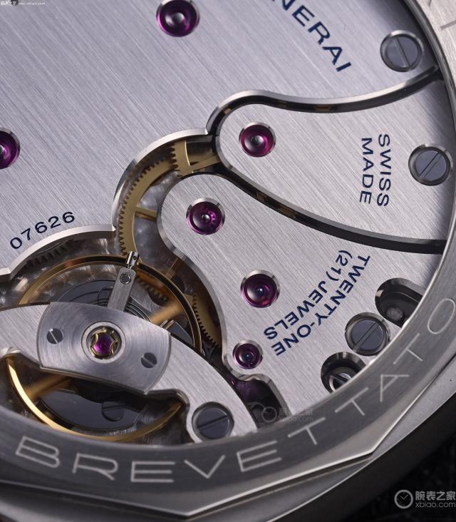 沛纳海的机芯,一直都是大开大合,风格粗大,自成一体。抛光装饰方面,一直是上夹板全部拉丝,下夹板用鱼鳞纹装饰。但是在粗扩的过程中,也有很多细节。可以看出,机芯夹板有很多尖角、弧形的组合,而且都是倒角和抛光的。摆陀夹板减震器位置,改为环形拉丝,与整体水平拉丝不同。P30000在数据方面 运动,用无卡重量微调摆陀,摆频 21600 次 / 时,动力 3 天。