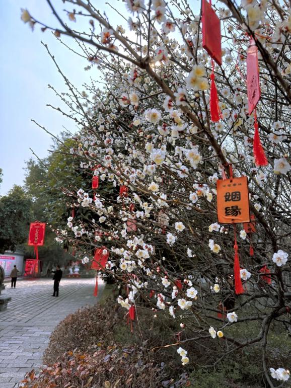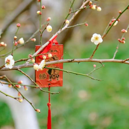 祈福牌挂在梅枝间,随风轻轻摇晃。