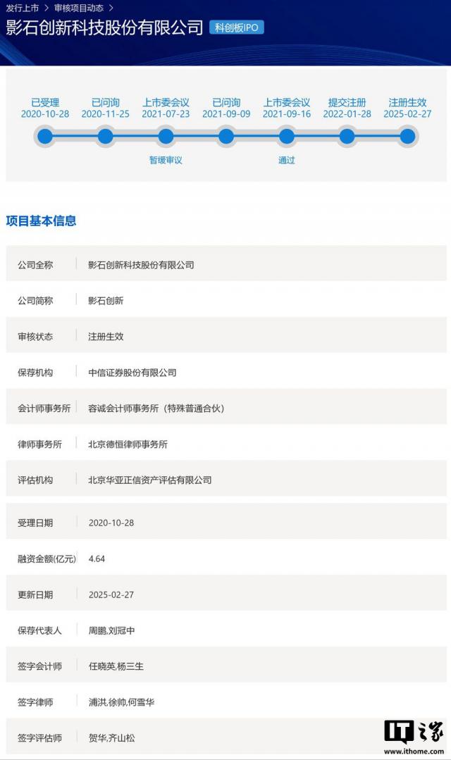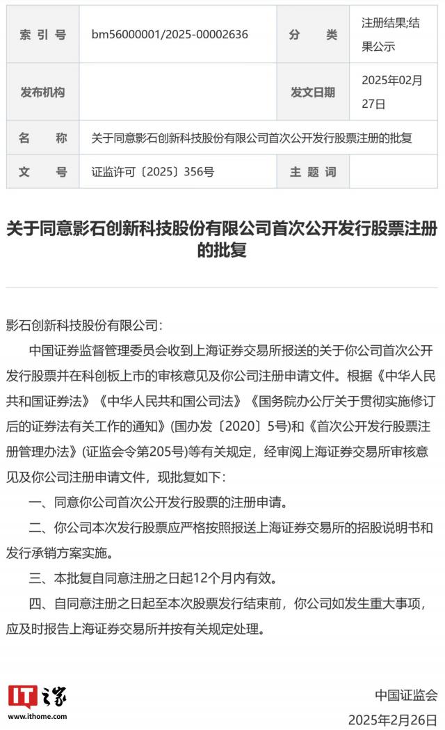 IT 世家 2 月 28 日消息,昨天中国证监会官网(2 月 27 日)发布公告,在《关于同意影石创新科技有限公司首次公开发行股票注册的批复》中,同意影石创新首次公开发行股票的注册申请,有效期自批准注册之日起 12 在一个月内有效。