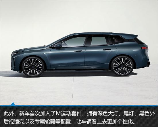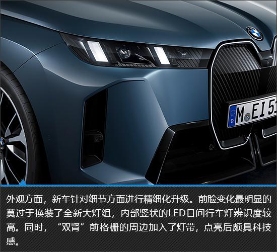 新款宝马 iX 外观上没有太大的变化,只是对细节进行了优化和提升。其中,垂直的 LED 日间行车灯和环绕式格栅灯带为整车增添了现代感。值得一提的是,这款新款宝马 iX 宝马家族首次加入经典家族。 M 锻炼套件,更讨年轻消费者喜爱。