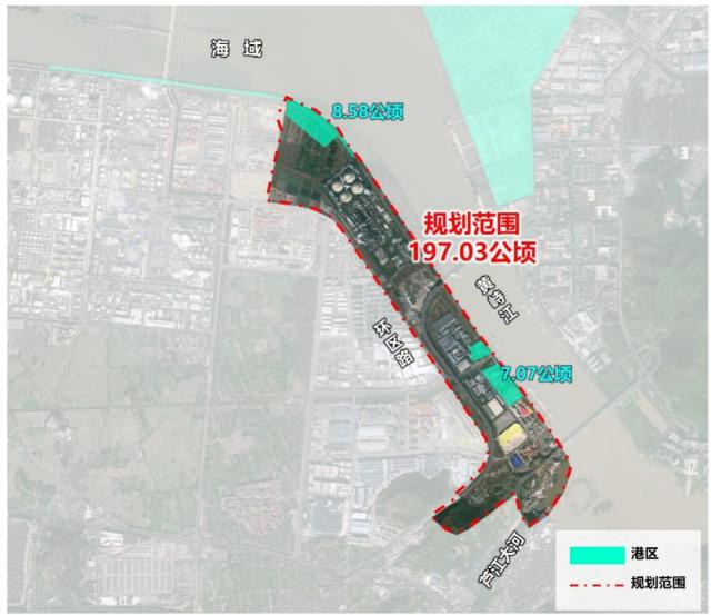 控制规定的编制范围西至环路,北至水域,东至黄峙江,南至芦江大河。,规划面积为 197.03 公亩。就地图而言,该地区位于大榭岛西南部,形似“撇”。