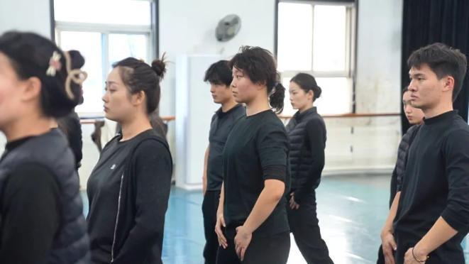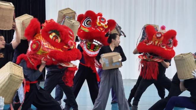 非物质舞蹈节目《舞狮少年》排练现场。中间是演员朱依婷。吴翰林/摄影师