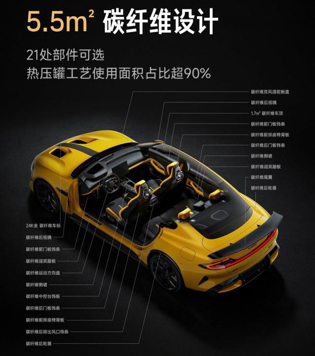 比如,5m² Alcantara® 包覆,5.5m² 环绕式碳纤维设计;