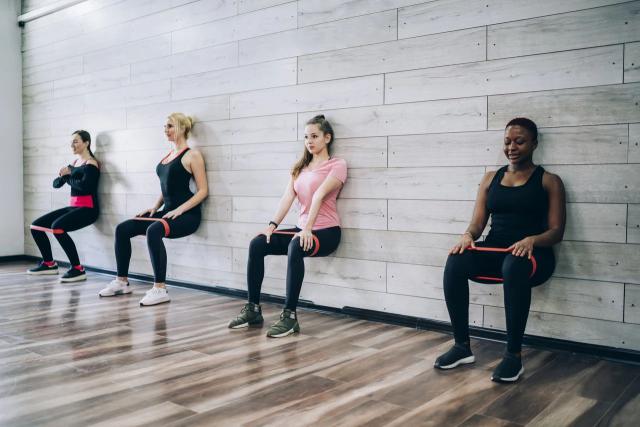 背对墙面约 50cm 站立,双脚分离与肩同宽,慢慢弯曲膝盖,将腰、背、臀靠近墙壁呈半蹲姿,膝关节方向与脚尖一致,面向前方;膝盖骨向前不要超过脚趾,膝盖不要内扣。