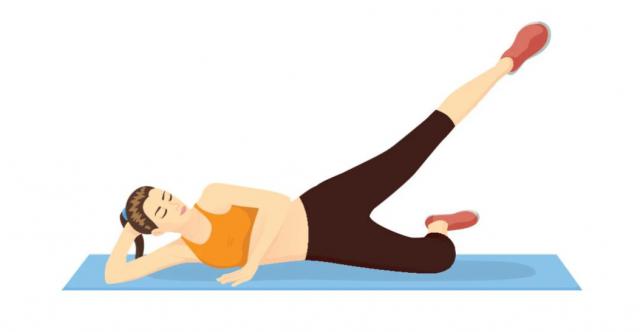 侧卧,双腿叠放,靠近床体的腿弯曲增加承受能力,伸直上腿并将其抬高到床体附近。 45 度。维持 5~10 秒,放下,短暂放松。