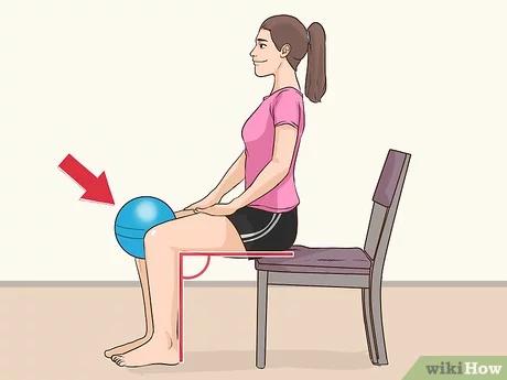坐在椅子上,保持腰部直立,双腿膝盖中间放一个球或水瓶,夹住双腿,轻轻踮起脚跟。这时,你会感觉到大腿肌肉的力量。坚持住 40 秒(照片中只有演示动作,停留时间较短),慢慢放下休息,然后继续,继续做, 10 第二,早晚各做一次。