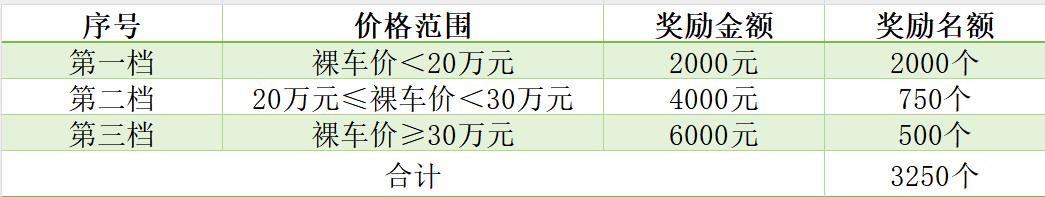如果高门槛奖励名额已经发放,可以按次级申请奖励。比如消费者选择裸车价格在30万元(含)以上的家用新车或新摩托车。如果奖励资金名额在6000元发放,消费者可以申请奖励4000元。如果奖励资金名额在6000元和4000元发放,消费者可以申请奖励2000元。