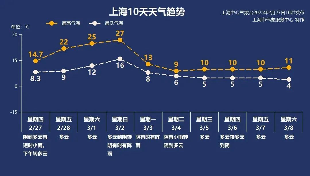 气温一步步上升,周日最高可达27℃左右。随着江淮气旋入大海,当地风速增加,夜间雨水袭来,偏南地区可能伴有雷击,气温迅速下降。下周一,最高气温只有13℃。寒风和冷雨使冬天的严寒翻倍。