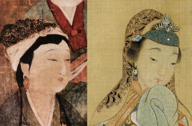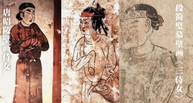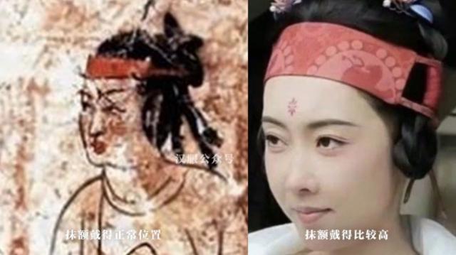 我们现在看到的大部分形象都是女性穿男装圆领长袍,戴抹额的形象。这个时候抹额相当于男装里的“毛巾”,但是女性简化了使用,同样简化的也有皮带。女性皮带也是用来装饰的,不挂物品。一般来说,抹额的佩戴方法应该覆盖一半的额头。如果太高,就没有办法保护额头。