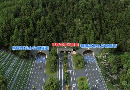 江鹤高速扩建TJ01标新建莲花山隧道位于江鹤高速龙湾交通与莲花山交通之间。新建隧道设计在既有江鹤莲花山隧道两侧,左右两侧为单孔四车道,右长346米,左长472米,最大跨度22.65米,距离现有隧道最小间距18.15米,是中国最大的小间距隧道。其中,去年12月右幅顺利贯通,目前左幅也已贯通,至此,江鹤高速新建莲花山隧道全线贯通。