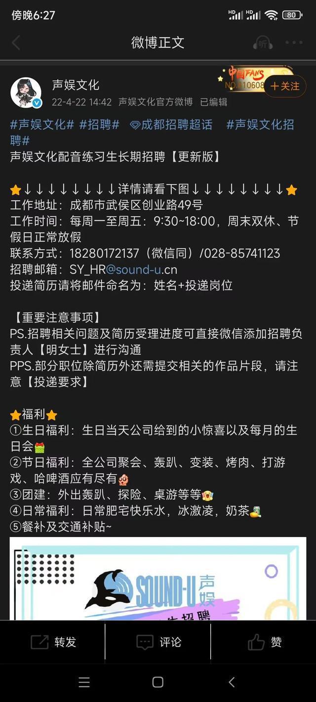 记者还查看了公司官方微博,发现声娱文化招聘配声练习生一事, 2021 年 12 月 20 日本发布了配声练习生招聘信息,微博文章曾在福利栏注明有五险一金。但是打开招聘信息的照片,发现练习生的五险一金备注了“转试就买”。2022 年 4 月 22 日本官方微博再一次发布了招聘配声练习生的消息,并未提及练习生五险一金的福利。