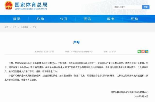 在比赛现场,有人侮辱和诋毁中国选手。乒乓球羽毛球中心:强烈谴责,严厉查处!2月26日,国家体育总局乒乓球羽毛球管理中心发布声明: