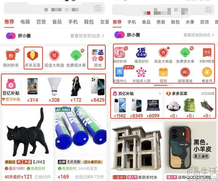 拼多多的新战略选择,似乎正在显露出来。 日常消息显示,拼多多App首页已经开始在小范围内进行改版测试。与现有版本相比,新版App首页最重要的变化是,多多杂货购物不再享受与100亿补贴相同的C位资源水平,而是与限时尖峰等频道并排展示,只显示入口处的图标,不再显示具体的产品信息。对于100亿元的补贴,它获得了更集中的显示区域和曝光率。