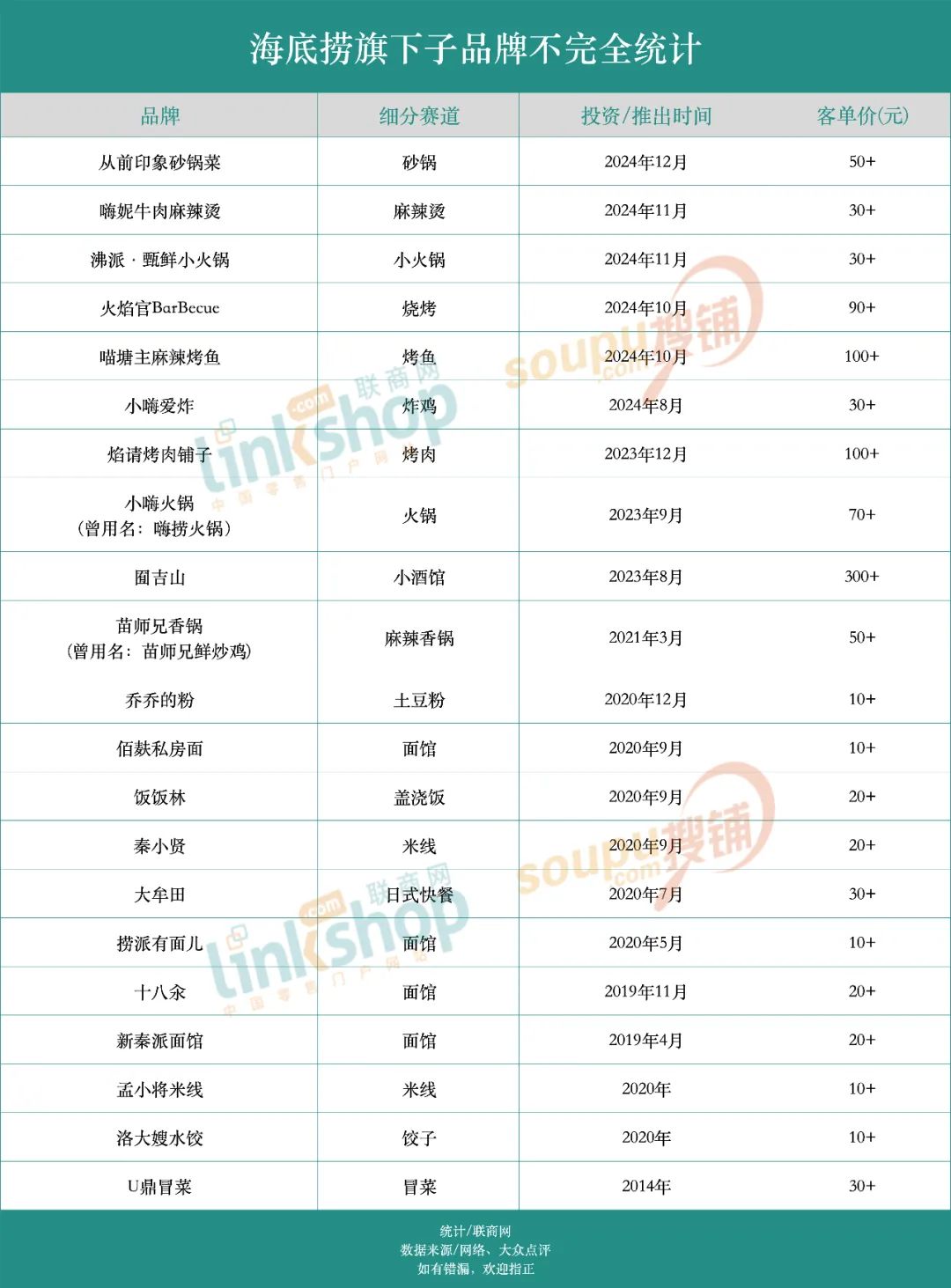 据《联商网》不完全统计,从2023年底开始,海底捞推出了至少9个餐饮子品牌,包括砂锅、火锅、烤串、炸鸡、烧烤、酒吧等。,其中包括许多热门跑道。
