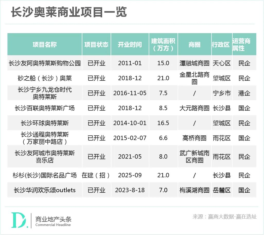 根据赢家的大数据,长沙已经开设了8个奥莱项目,共计90.1万平方米,另一个是新建的。民营企业、国有企业、港资不允许对方留下深刻印象,构建了一个“打折消费帝国”,从城市核心到远郊腹地,从过去的主城河东延伸到新城河西。