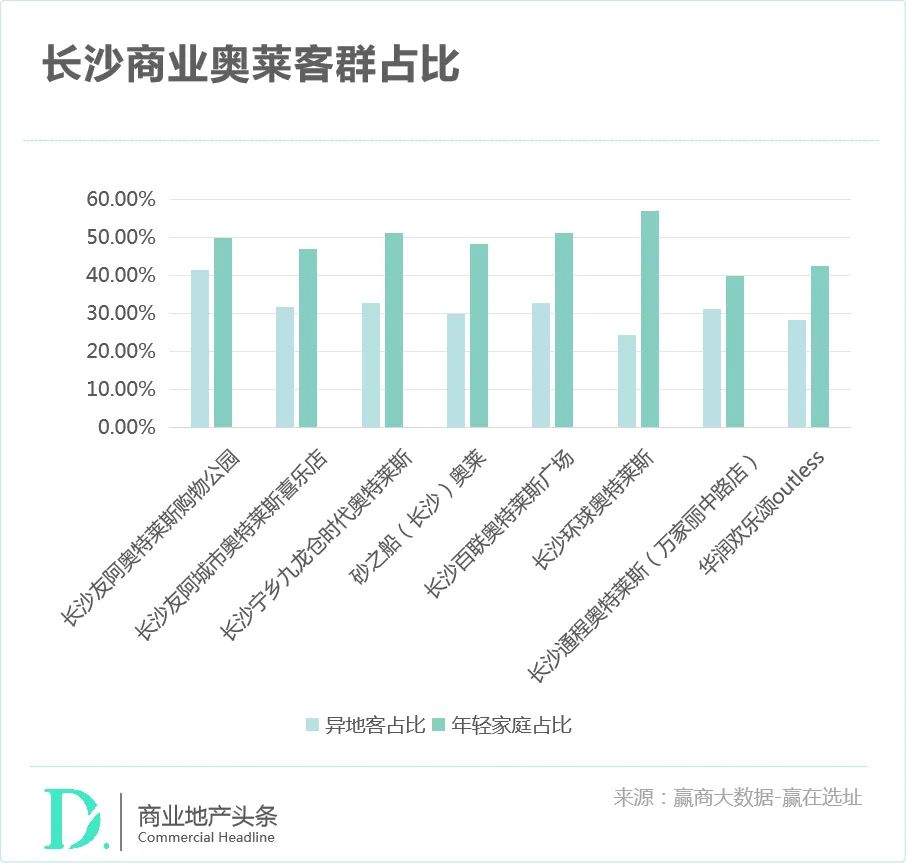 值得一提的是,奥莱项目的异地客户比例一般在30%以上。其中,由于“长株潭三市均可30分钟内到达”的最佳位置,“长沙奥莱鼻祖”友阿奥莱购物公园的异地客户比例高达41.3%。