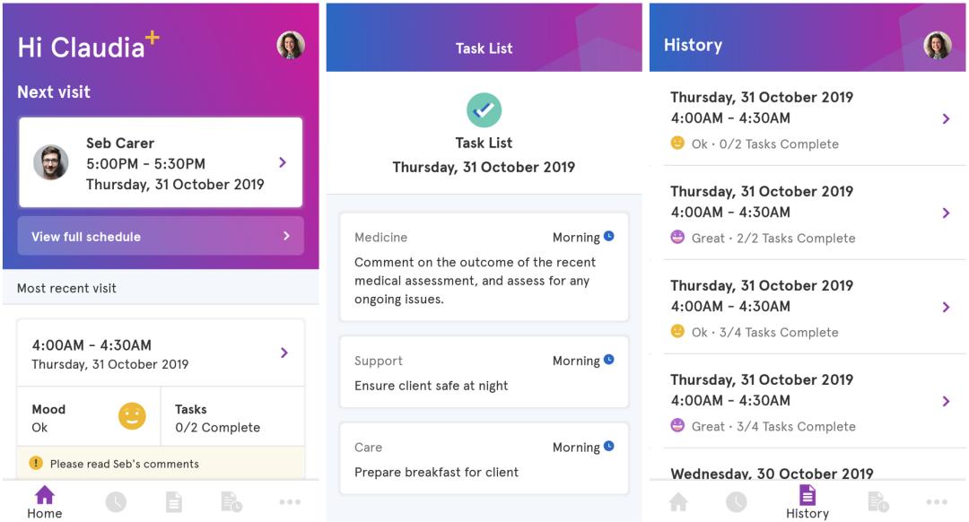 Cera Care 投入资源开发了两个移动应用程序 APP,为护士提供家访记录,上传护理报告,方便家人实时了解和监控亲人的护理和健康状况。。