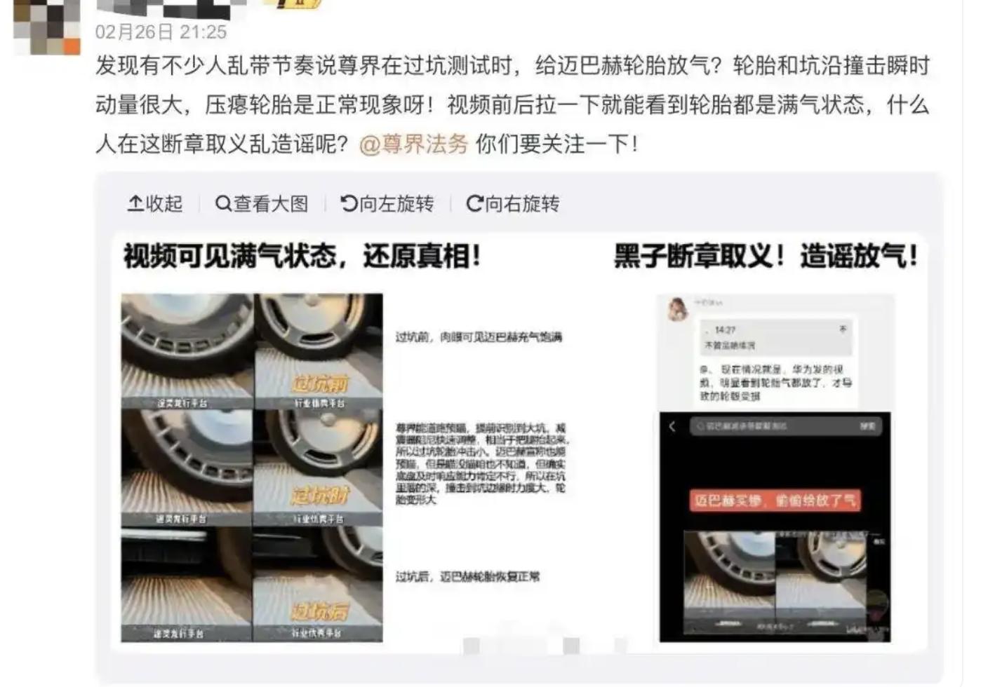 博主说:“我发现很多人抢人头,说尊重世界在过坑测试的时候给迈巴赫轮胎放气?轮胎和坑的碰撞瞬间有很大的动量,压扁轮胎是正常的!视频前后拉一下,可以看到轮胎处于满气状态。谁在这里造谣?你要注意!”