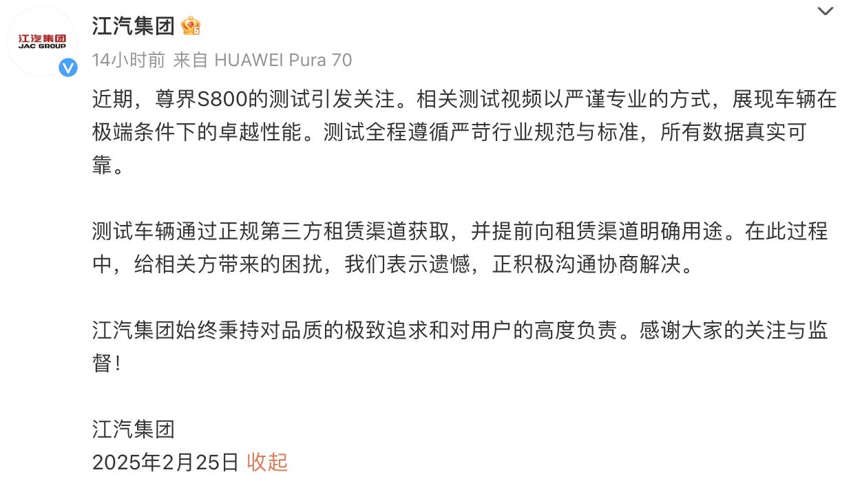 对此,江汽集团发文回应称,近日,尊界S800的检测引起关注。相关测试视频以严谨专业的方式呈现汽车在极端情况下的卓越性能。整个测试过程遵循严格的行业标准和标准,所有数据都是真实可靠的。测试车辆通过正规的第三方租赁渠道获得,并提前向租赁渠道明确使用。在这个过程中,我们对相关方带来的麻烦表示遗憾,并积极沟通协商。