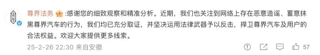 随后,@尊界法务在评论区回应称,已经关注到网络上恶意造谣、故意抹黑尊界车辆的行为,已经充分取证,并坚决使用法律武器进行反击,捍卫尊界汽车和用户的合法权益。