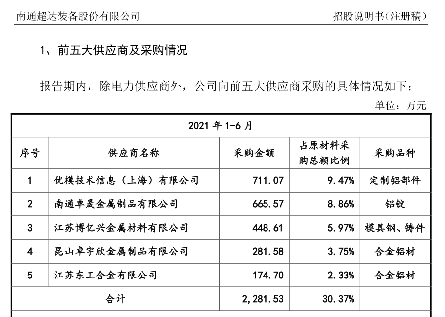 仅2021年1-6年,超达设备就在他们家购买了超过700万元的定制铝零件。