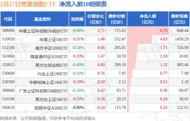 当天有 26 只宽基指数 ETF 资金净流入出现在基金中,其中华夏上证科技创新板排名第一。 50 成分 ETF(588000),份额增加 5.71 十亿份,净流入额为 6.73 亿元。