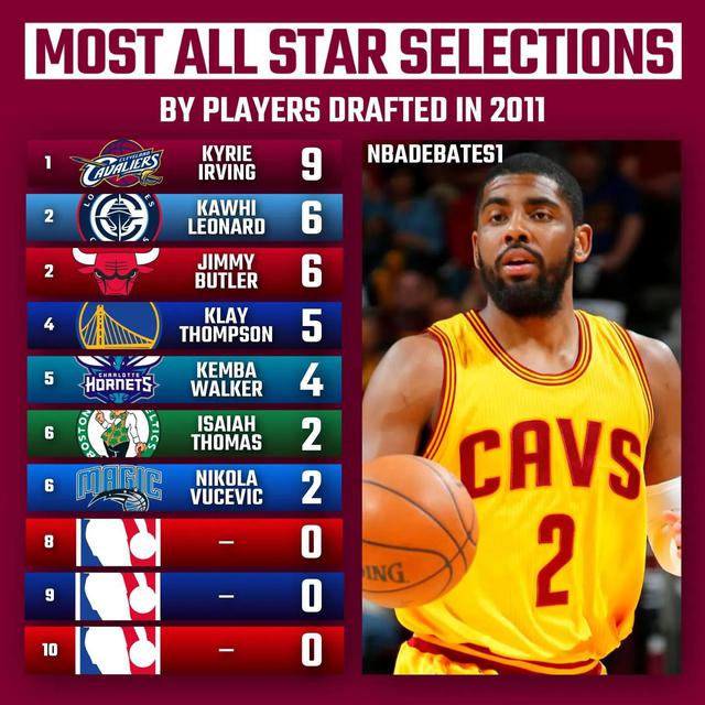 7 全明星比赛入选,凯里欧文 9 次,伦纳德 6 次,巴特勒 6 第二,克莱汤普森 5 第二,肯巴沃克 4 第二,以赛亚托马斯 2 第二,武切维奇 2 第二。如果凯里欧文没有得罪犹太资本,他会更频繁地入选。