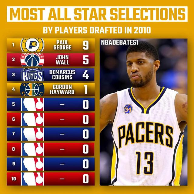 4 所有人都入选了全明星比赛,保罗乔治 9 第二,约翰沃尔 5 次,考辛斯 4 次,海沃德 1 第二。这次选秀,也只剩下保罗乔治一根独苗,最近保罗乔治关闭了播客节目,要致力于比赛。