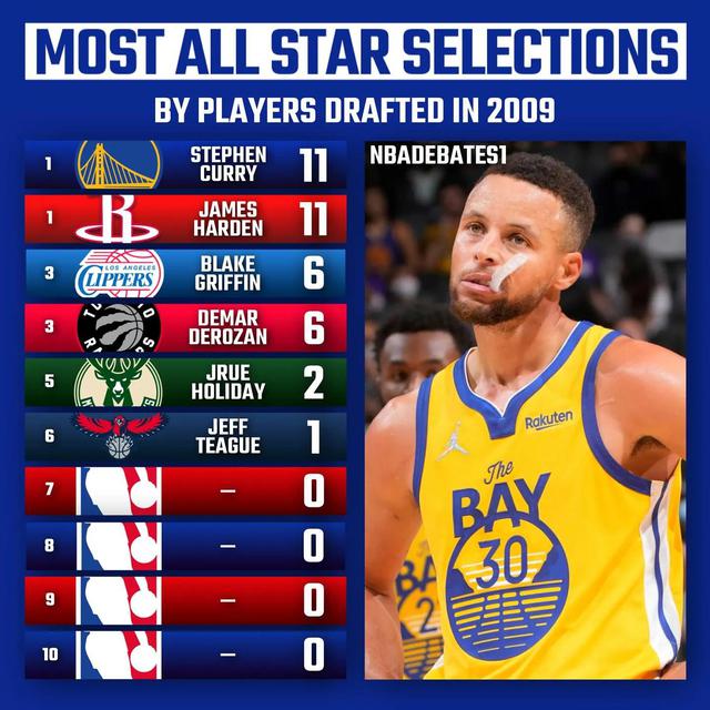 6 斯蒂芬库里里入选全明星比赛。 11 第二,詹姆斯哈登 11 次,格里芬 6 次,德罗赞 6 第二,朱霍勒迪 2 第二,杰夫蒂格 1 第二。斯蒂芬库里和詹姆斯哈登并排 11 第二,如果没有逃离火箭,詹姆斯哈登当选全明星大赛的频率要高于斯蒂芬库里。