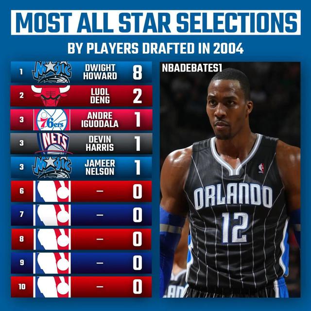 5 德怀特霍华德入选全明星赛。 8 次,洛尔邓 2 第二,伊戈达拉 1 第二,德文哈里斯 1 次,尼尔森 1 第二。伊戈达拉是一个被低估的全明星球员,他处于巅峰,但76岁。 老大,后来自降身价,加入金州勇士,获得四个冠军。