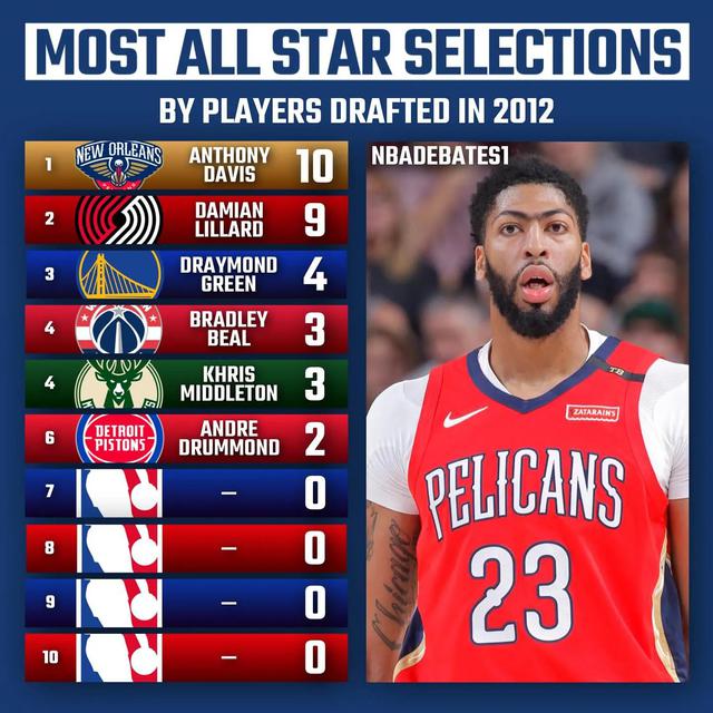 6 安东尼戴维斯入选全明星比赛。 10 次,利拉德 9 第二,德雷蒙德格林 4 第二,布拉德利比尔 3 第二,米德尔顿 3 第二,德拉蒙德 2 第二。今年安东尼戴维斯入选,可惜由于伤病问题,导致未能如愿参加,只能放弃这次机会。