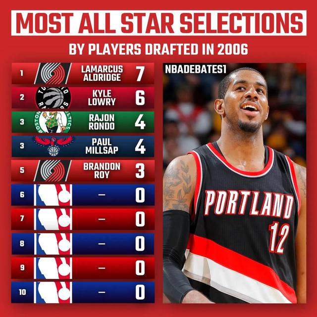 五人入选全明星赛,阿尔德里奇 7 第二次全明星大赛,凯尔洛瑞 6 次次当选,隆多 4 第二,保罗米尔萨普 4 次,罗伊 3 第二。罗伊是一个非常遗憾的人,因为受伤,导致他很早就退伍了。