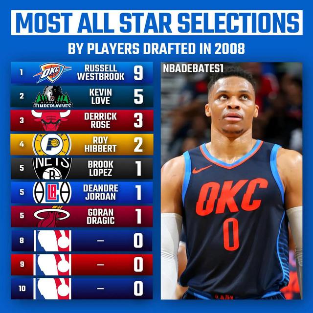 6 所有人都入选了全明星比赛,威少 9 第二名是乐福,第二名是乐福 5 次,罗斯 3 第二,罗伊希伯特 2 次,洛佩兹 1 次,小乔丹 1 第二,德拉季奇 1 第二。罗斯是一名状元选秀,如果没有伤病,他无疑是那一届最好的球员。