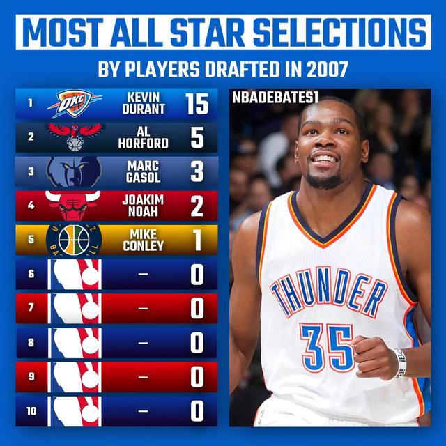5 凯文杜兰特入选全明星比赛。 15 次,霍福德 5 第二,马克加索尔 3 次,诺阿 2 第二,迈克康利 1 第二。现在,凯文杜兰特、迈克康利和霍福德仍然存在, NBA 打球。然而,都是职业生涯的结束。